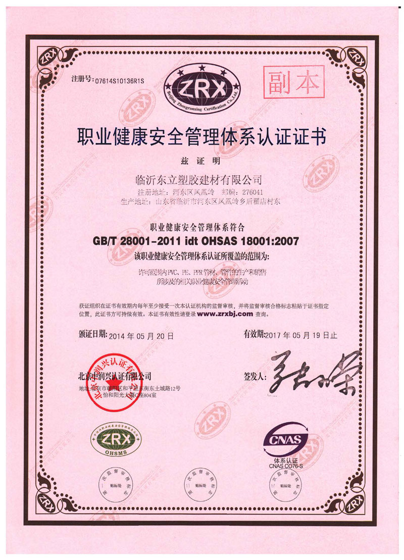 職業(yè)健康安全管理體系認證證書